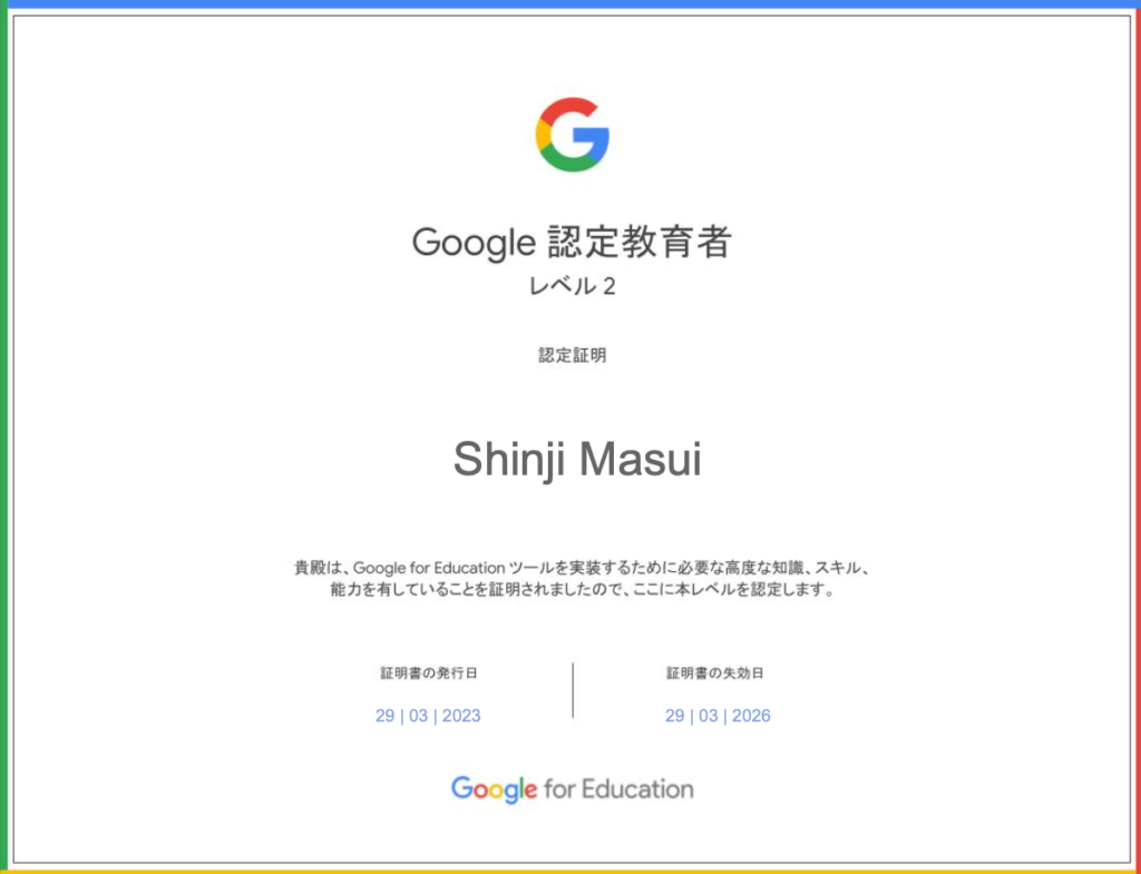 | 2023 | Google for Education Google Certified Educator Level 2 – Japan 合格 | Google 認定教育者について |